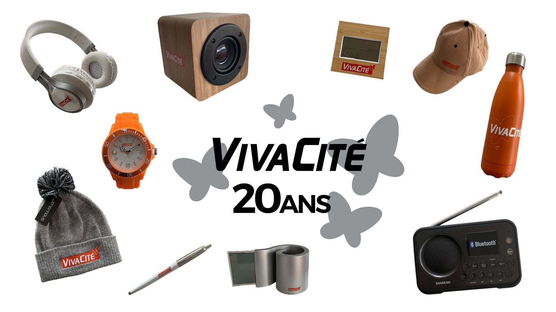 parce que vous faites partie de la grande famille VivaCité, pour nos 20 ans, c’est nous qui vous offrons des cadeaux ! Tentez de découvrir quels animateurs se cachent derrière nos photos floutées et à vous des cadeaux aux couleurs de VivaCité : radio DAB +, bonnet, bic, montre, station météo, gourde, haut-parleur… Egayez votre quotidien avec nos objets labellisés !
